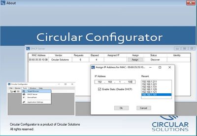All the network setup and configuration of the Circular Solutions Modules are achieved by means of the Circular Configurator device configuration tool. This tool can be downloaded from the link below and includes the following embedded tools to simplify the setup and use of the modules: